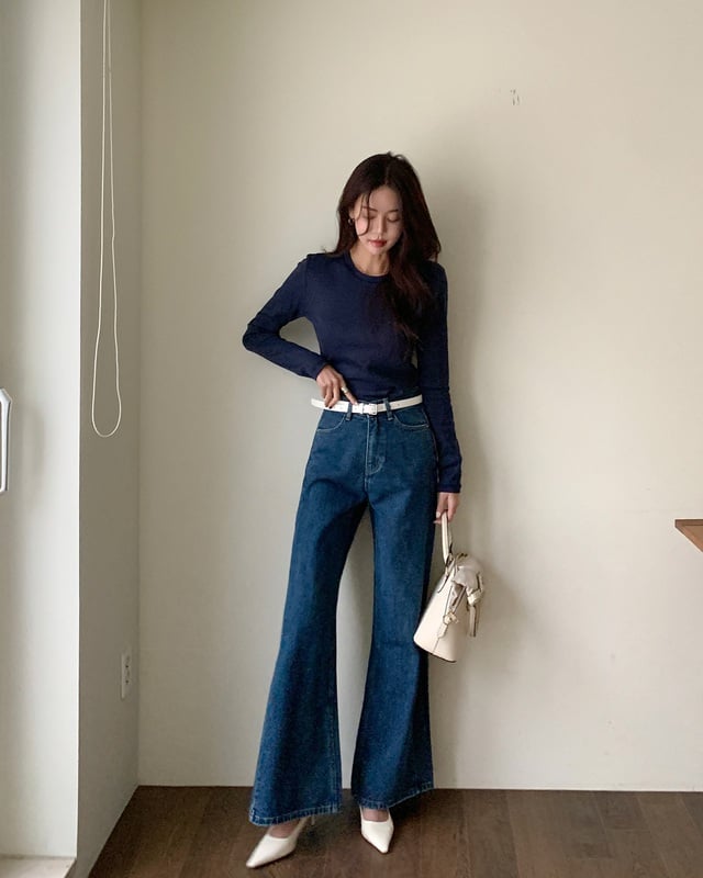 Charcoal is a sophisticated color that also brightens your complexion. Pairing a charcoal long-sleeved tee with flared jeans creates a youthful and trendy look. Accessorize with a brown belt, pointed-toe heels, and a white bag for a polished and refined finish.