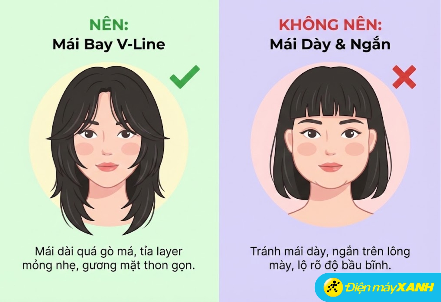 Avoid thick bangs or those above the eyebrows, as they emphasize the roundness of the cheeks, making the face look fuller.