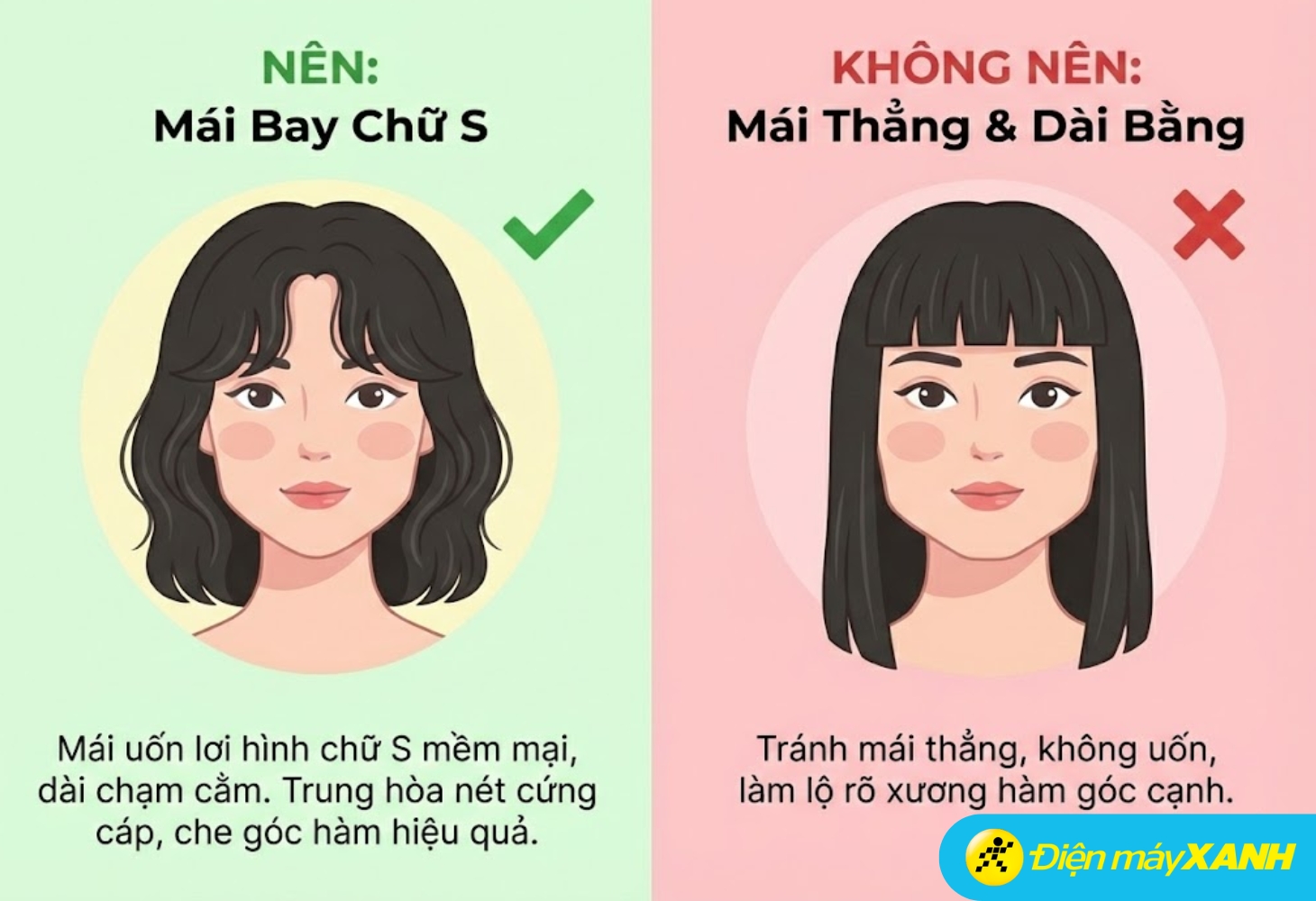 Ideal length is chin-level or slightly lower. These bangs effectively conceal the angular jawline.