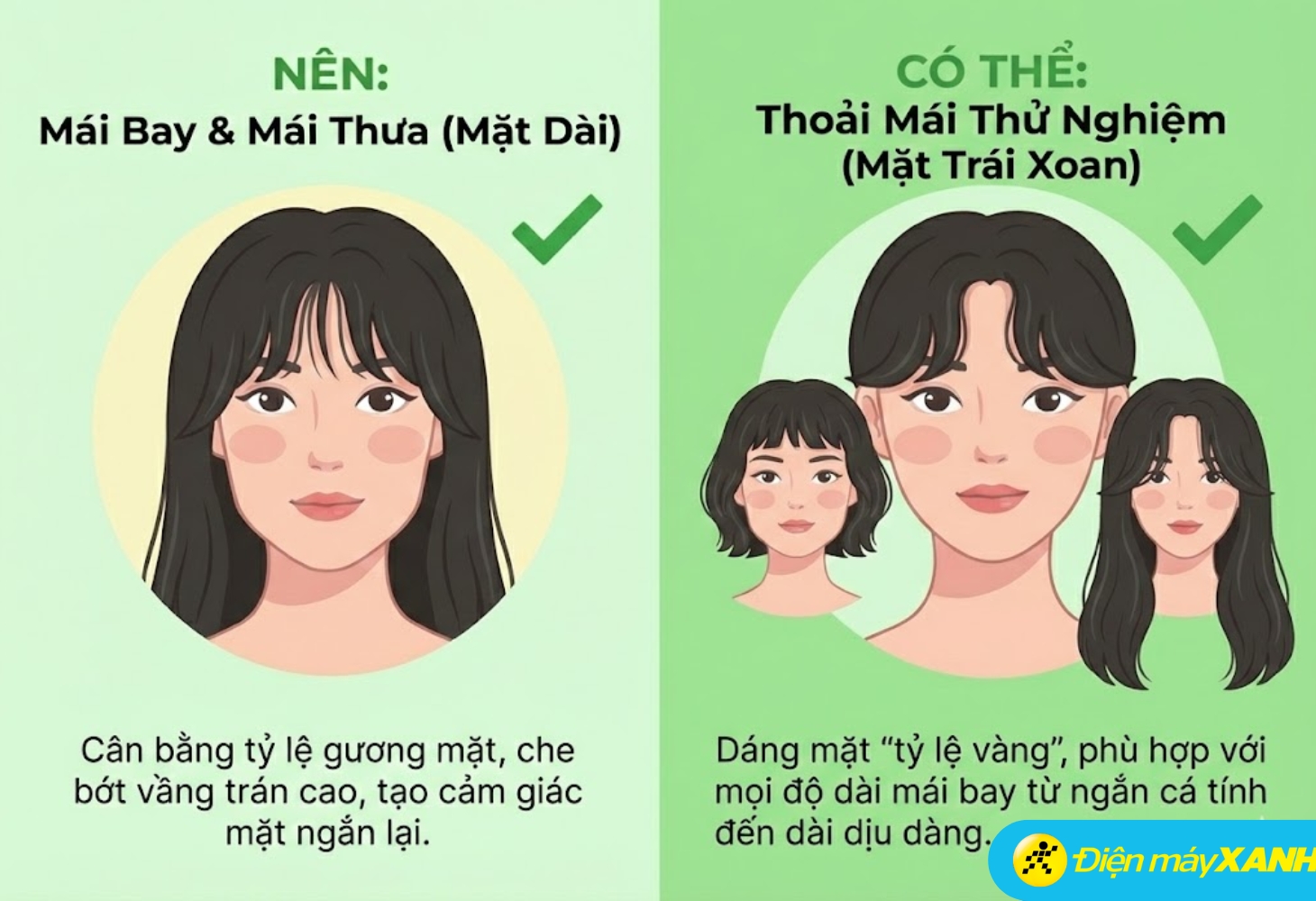For long faces, combine side wispy bangs with a few thin strands in the middle to balance proportions and shorten the face.