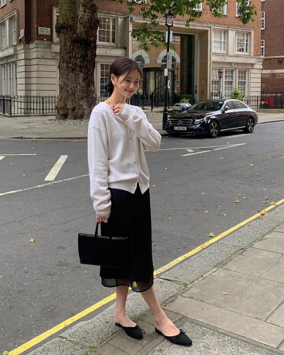 This year-end, solid-colored ballet flats in soft leather or satin are favored for their versatility with various skirt styles. When paired with A-line or midi skirts, they create a graceful and airy look.