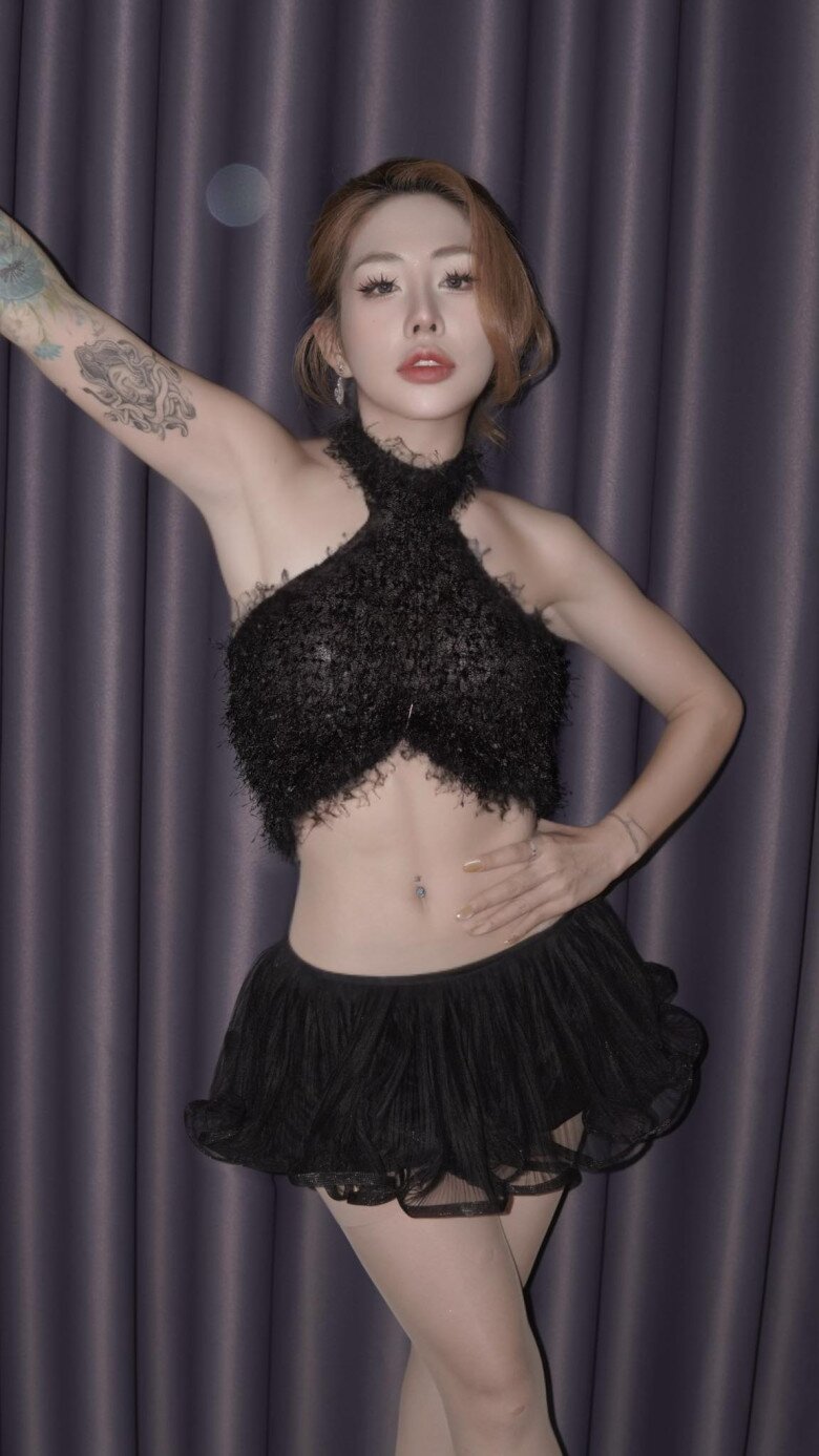 A bold all-black outfit featuring a fluffy crop top and layered mini skirt highlights Du Uyên’s tiny waist and long legs.