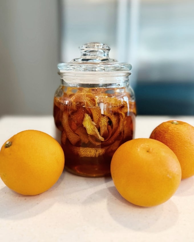 Linh Rin creatively repurposes the peels of blood oranges by drying them and infusing them with honey, adding a few slices of ginger. She describes the blend as “sweet, with a citrusy aroma, a hint of spice, and a refreshing finish.”