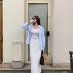 When embracing a more active style, she often wears a white cardigan with blue jeans—a classic combo that never goes out of style. The cropped cardigan balances her proportions, elongating her figure and accentuating her height.