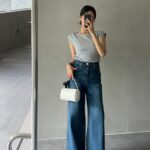 Beyond classic full-length jeans, try cropped retro-style jeans. Paired with a white blouse, matching belt, and bag, it’s a fresh, flirty look with vintage charm.