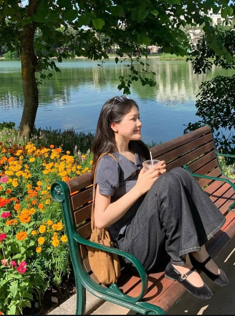 Scenery and people are the key elements for stunning photos. Most amateur photographers apply the rule of thirds: one-third for the subject, two-thirds for flowers, or a frontal angle to highlight the landscape. Creative photography techniques make check-in photos at Hoan Kiem Lake diverse and vibrant.