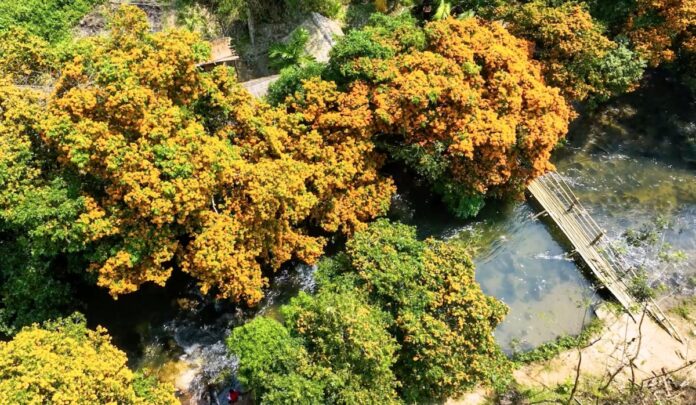 The wild orchids bloom in clusters, covering the tree canopies with vibrant orange and red hues, and filling the air with their subtle fragrance. This creates a peaceful, cool, and refreshing natural atmosphere.