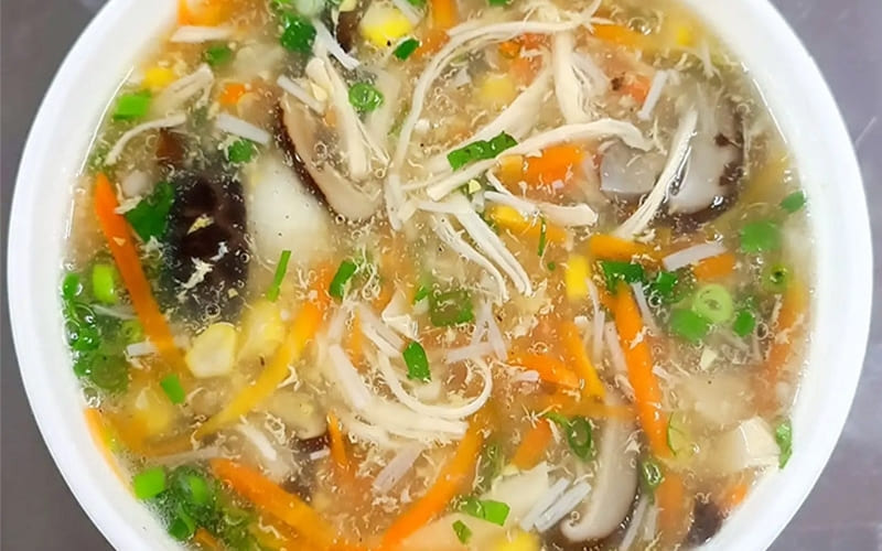 Boil water, add carrots and corn for 5 minutes to release natural sweetness. Add sautéed chicken, simmer for a few minutes. Add shrimp and quail eggs, adjust seasoning. Slowly pour beaten egg into the boiling soup for egg ribbons. Mix cornstarch with water, add to thicken. Garnish with green onions and serve.
