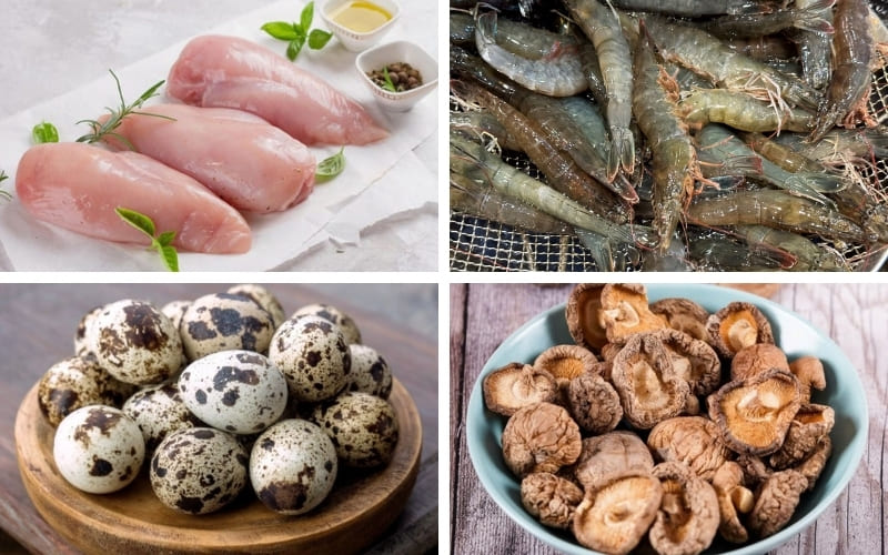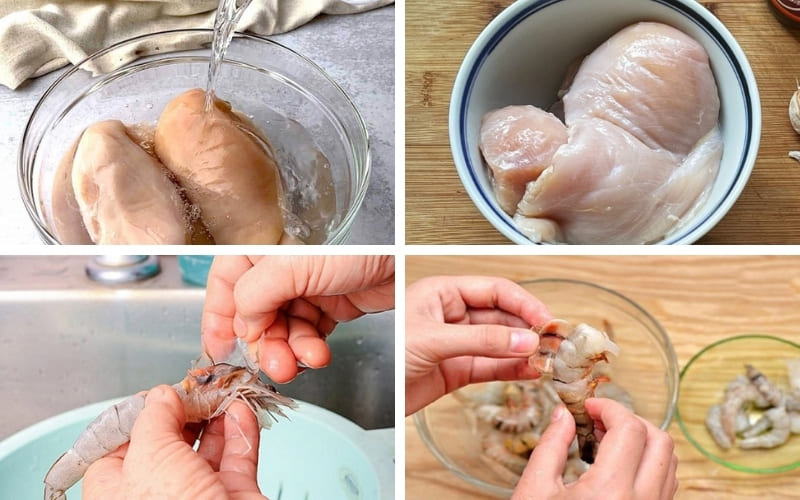 Rinse chicken breast with diluted salt water, gently scrub with ginger to remove odors, then rinse and pat dry. Peel shrimp, remove veins, rinse thoroughly, and pat dry.