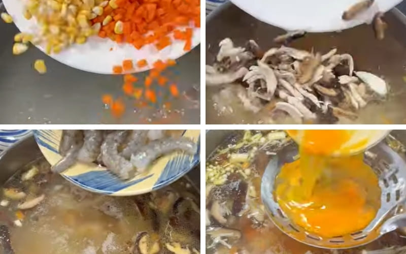 Boil water, add carrots and corn for 5 minutes to release natural sweetness. Add sautéed chicken, simmer for a few minutes. Add shrimp and quail eggs, adjust seasoning. Slowly pour beaten egg into the boiling soup for egg ribbons. Mix cornstarch with water, add to thicken. Garnish with green onions and serve.