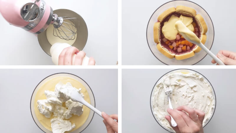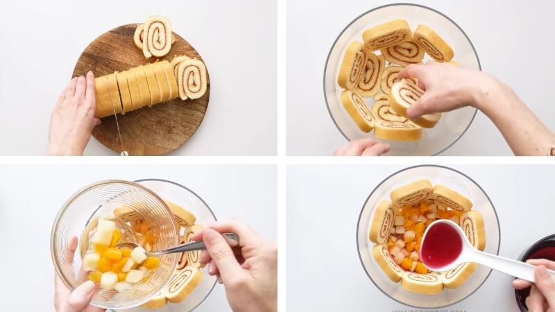 Cut the Swiss jam roll into slices about 1.5–2cm thick. Arrange a layer of cake to cover the bottom of a clear trifle dish for a visually appealing look. Evenly spread the drained canned fruit over the cake, using a spoon to ensure it doesn’t float.