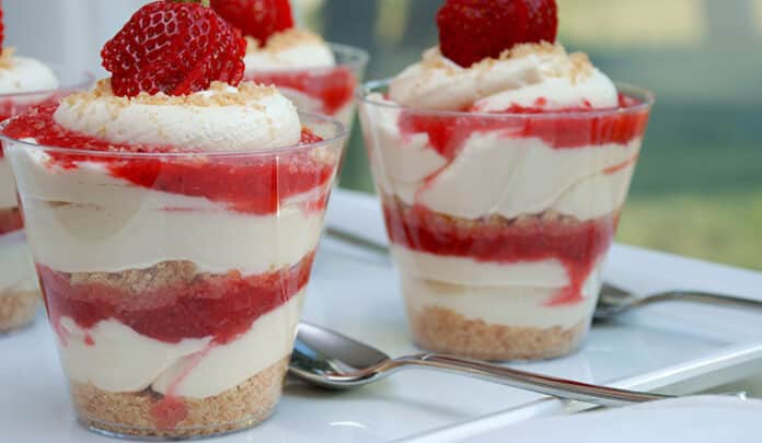 Repeat the layers in the order of cream, crushed cookies, and strawberry syrup. Finish with a final layer of cream and garnish with fresh strawberries.