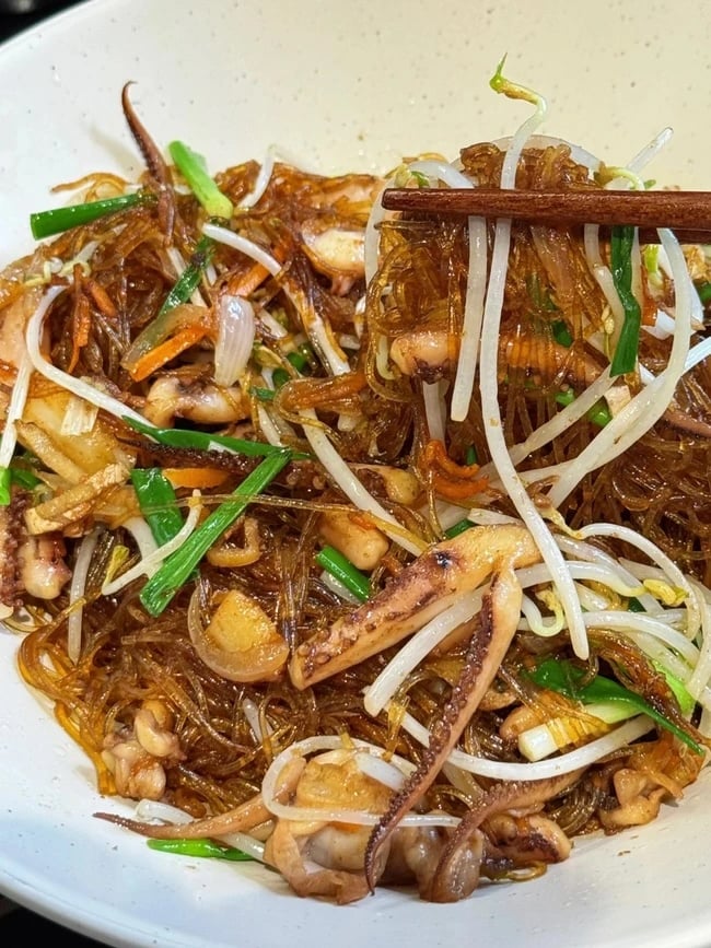 On days when you crave a change of flavor, stir-fried squid with glass noodles is the perfect choice to elevate your meal. The translucent noodles, paired with the natural sweetness of fresh squid, and the aromatic notes of garlic and ginger, create a dish that’s both light and richly flavored.