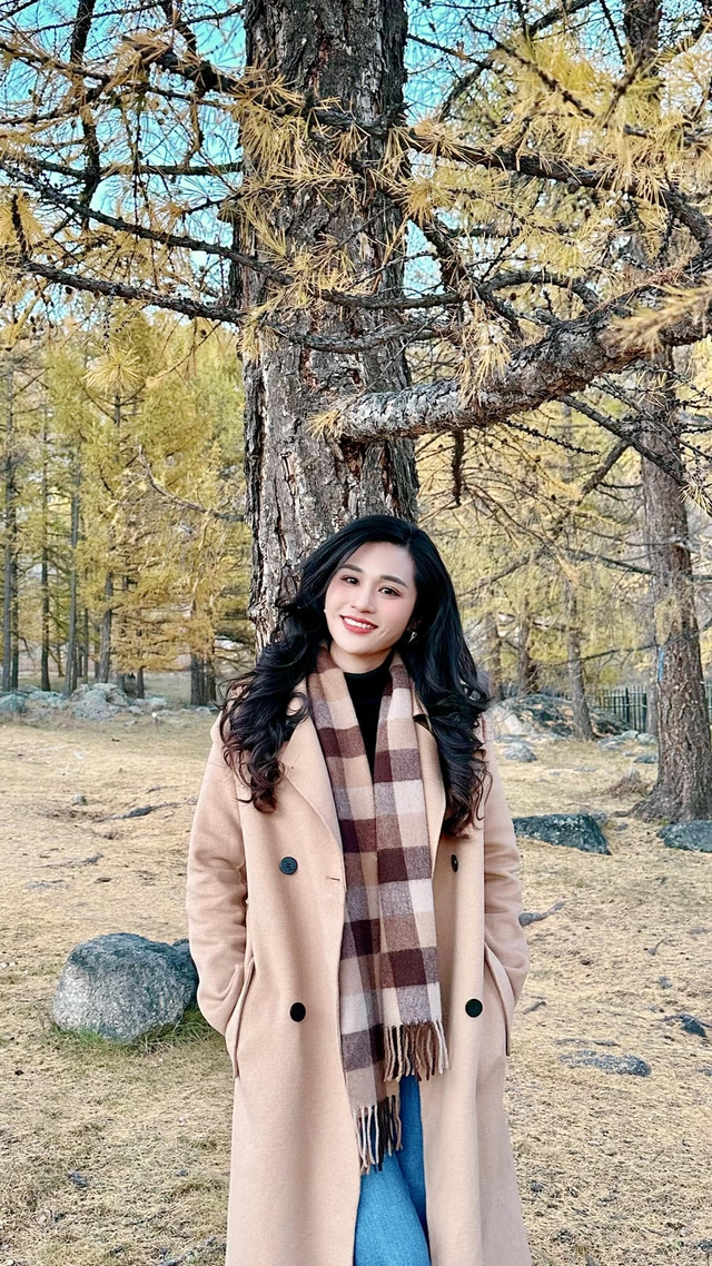 In another look, Broadcaster Minh Trang exudes elegance in a long wool coat, jeans, and a matching scarf.
