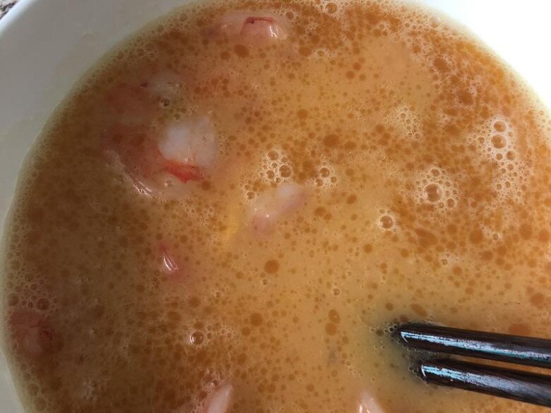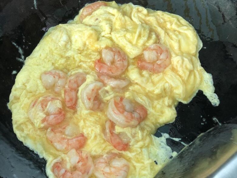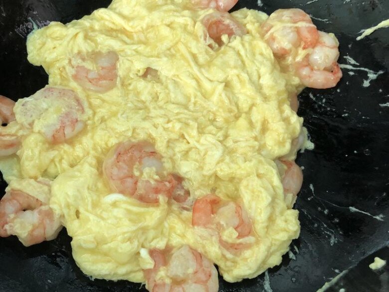 Heat a pan with a little oil, pour in the shrimp and egg mixture. Cook over medium heat, stirring gently with a spatula.