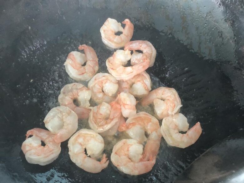 Heat oil in a pan, add the shrimp, and stir-fry quickly until they change color. Remove immediately.