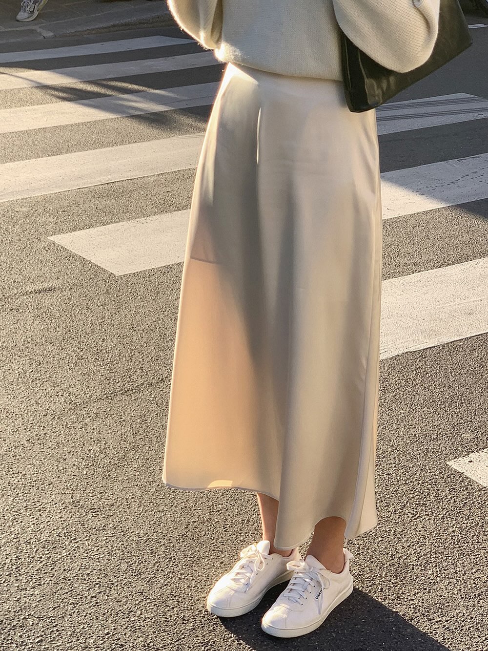 This combination is a go-to for many in daily life. Pairing white sneakers with A-line, midi, or pleated skirts creates a neat and approachable look.