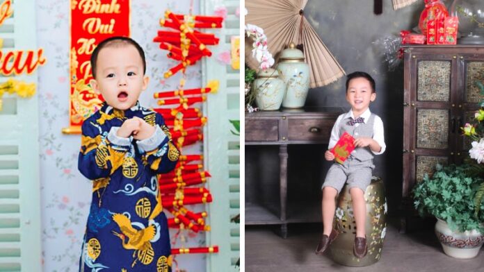 The Lunar New Year always comes with meaningful wishes. Have your child pose while giving New Year greetings to create an impressive photo. Dress them in a modern ao dai, standing straight with hands naturally placed.