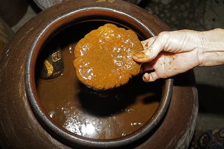 During fermentation, producers must regularly inspect and stir the jars to prevent sedimentation and ensure the eggplants remain fully submerged. Stirring must be done carefully, only in the early morning, as direct sunlight can spoil the mixture, causing sourness or mold. The jars, made of unglazed earthenware, are exposed to sunlight, which is crucial for the fermentation process. Even minor oversights—such as excessive moisture, dryness, or exposure to harsh sunlight—can ruin an entire batch.