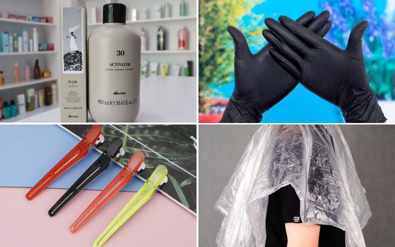 Ensure all essentials are ready: hair dye, gloves, clips, brush, and cape.
