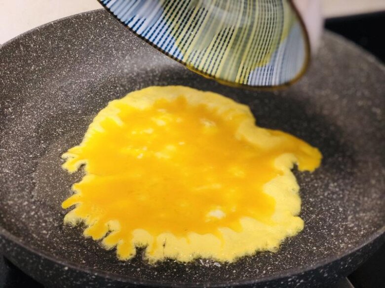 Pour the egg mixture into the pan, spreading it evenly to form a thin layer like a crepe.