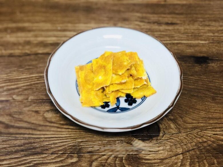 Transfer the egg to a plate, let it cool, and then cut it into strips or bite-sized pieces.