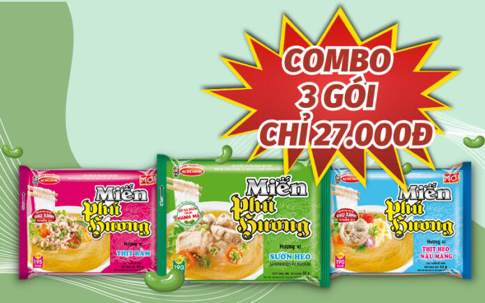 – 3 packs of Phú Hương pork rib glass noodles 55g for only 27,000 VND, original price 34,500 VND