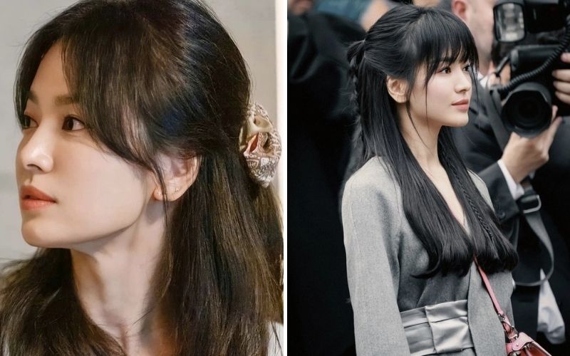 Song Hye Kyo often opts for the half-up half-down hairstyle when attending fashion shows or magazine shoots. This youthful look is achieved with wispy bangs or side-swept bangs. The combination creates a slimmer, more graceful facial appearance.
