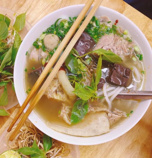Tender beef, chewy pork blood cubes, and crispy pork hocks blend harmoniously in a large, hearty bowl. The menu also includes beef balls, pork hocks, and spring rolls, enriching the flavors of the Hue beef noodle soup.
