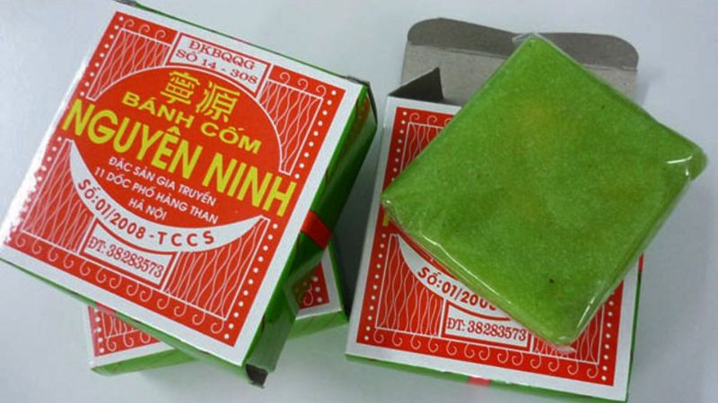 To identify genuine cốm cakes, examine the packaging. Authentic ones feature upright, capitalized fonts, with “Nguyên Ninh” written in Chinese characters, not the “hỷ” symbol.