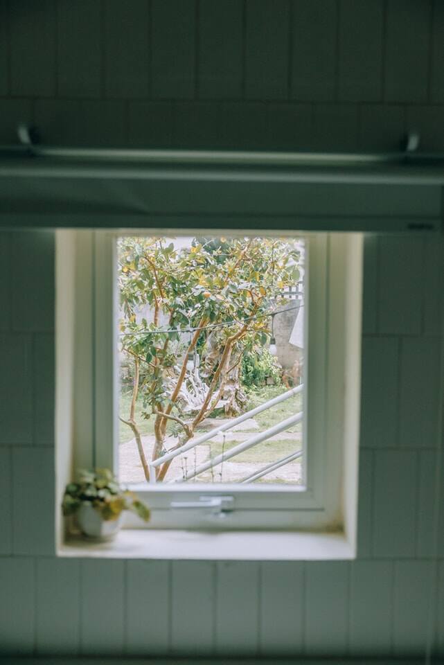 The kitchen window overlooks the garden. The dining area features a wooden table and a large flower arrangement, offering a meal experience amidst nature.