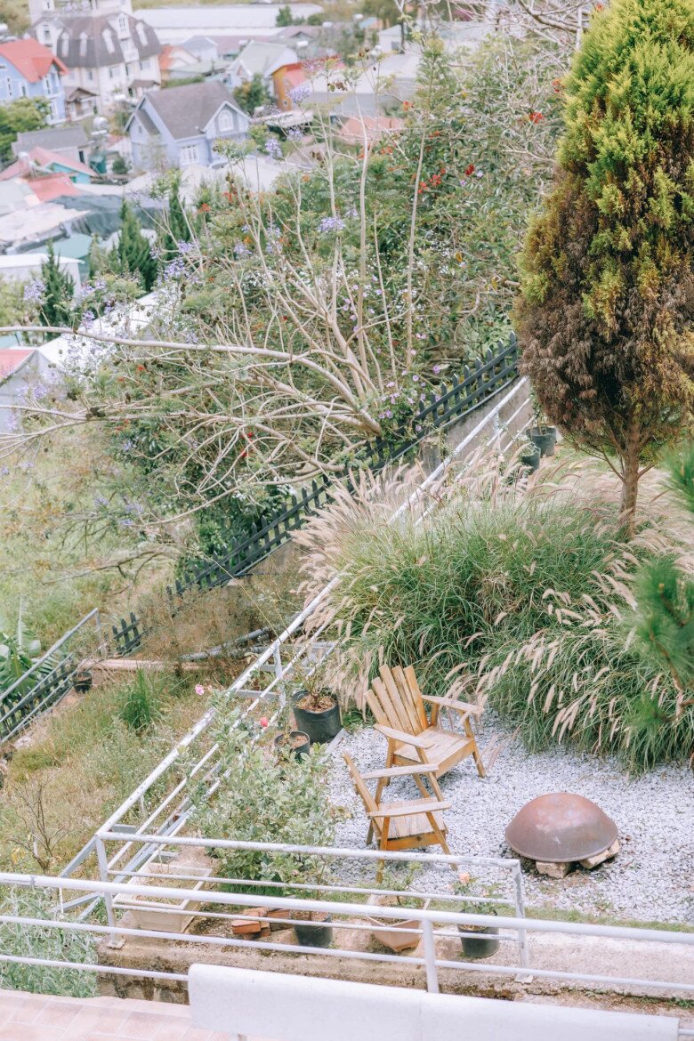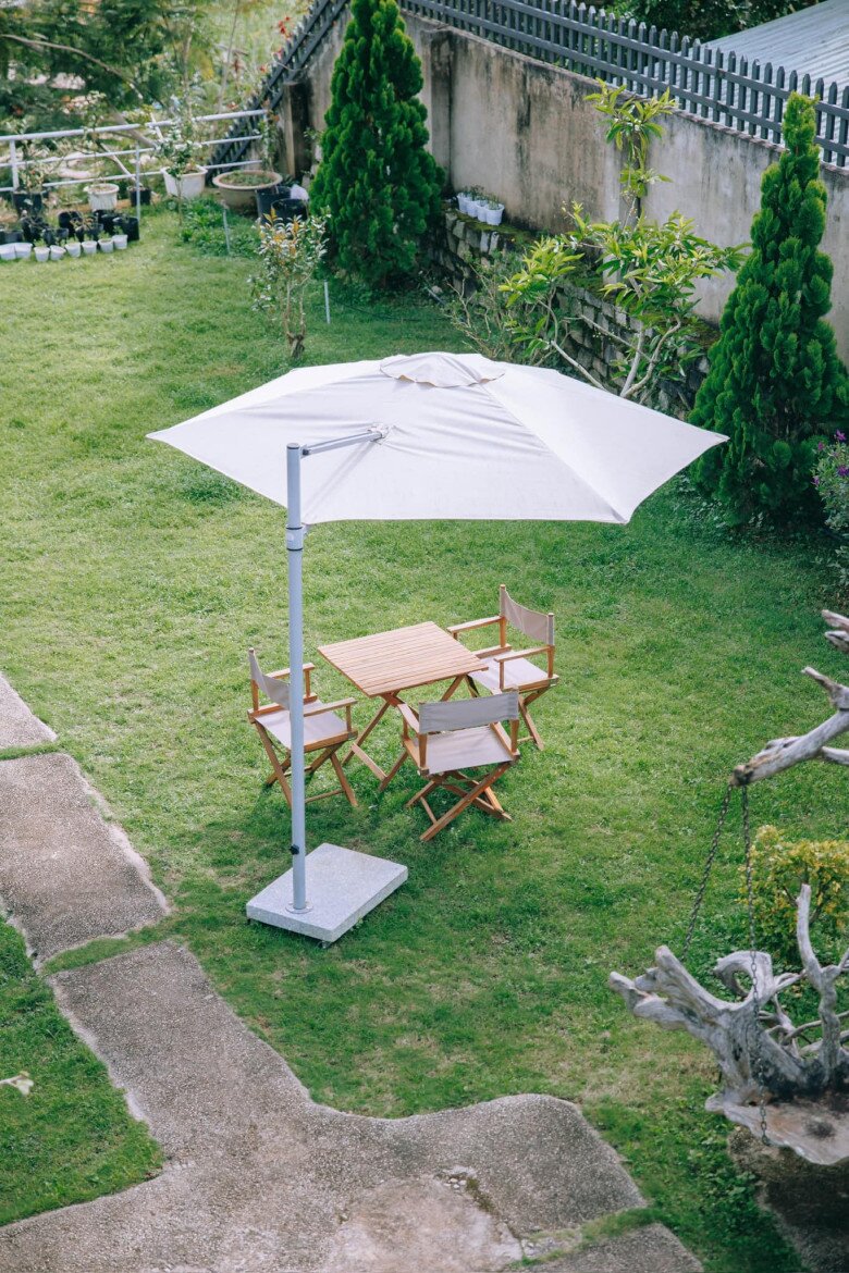 An outdoor tea area features a table and chairs under a large umbrella, perfect for enjoying afternoon tea in Da Lat’s pleasant weather.