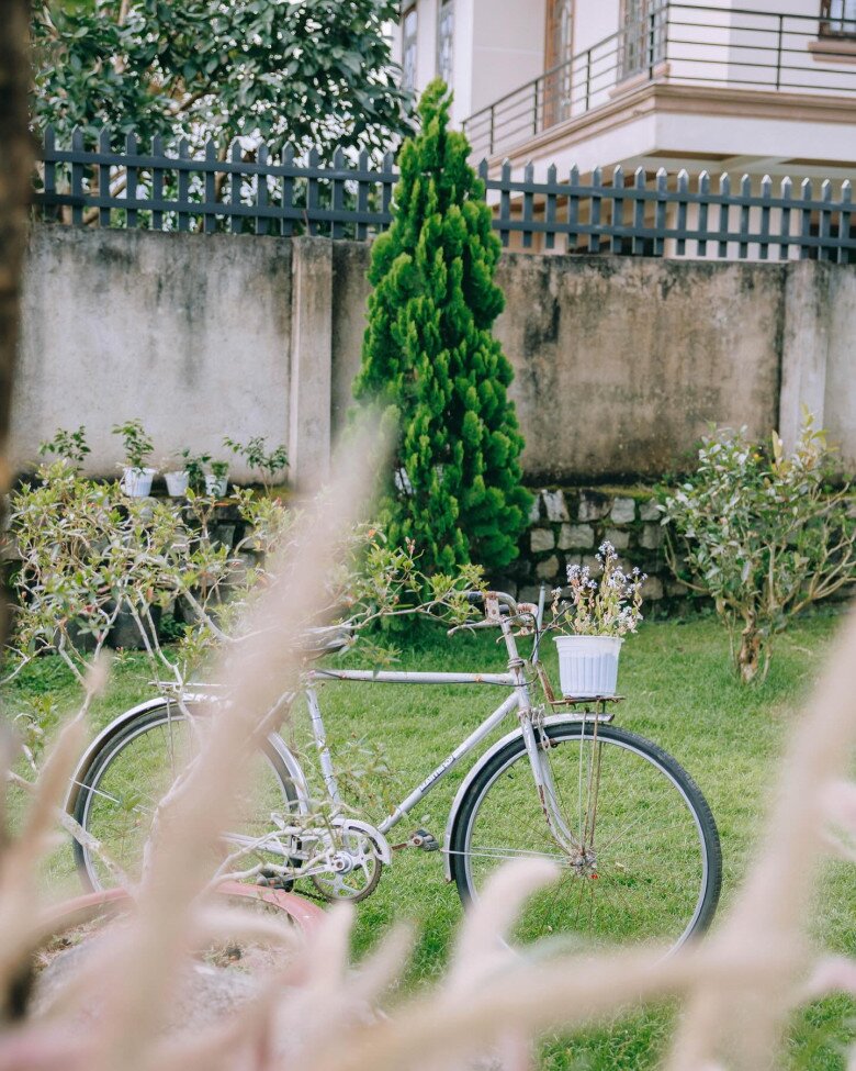 Charming details like a weathered bicycle repurposed as a unique garden accent, complete with a small flower basket, add character.